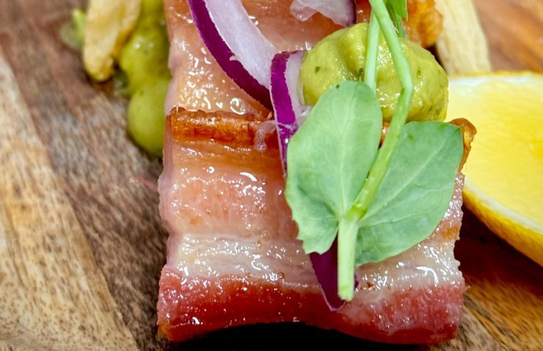 Brioche casero con mantequilla, Pulled pork, cebolla caramelizada