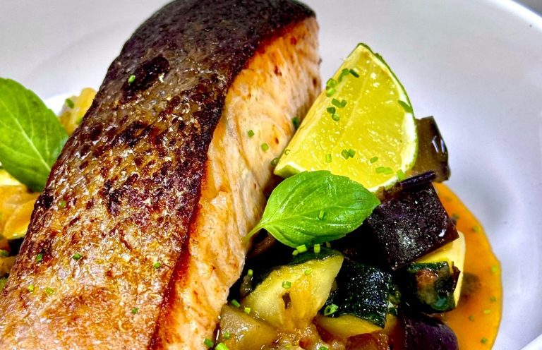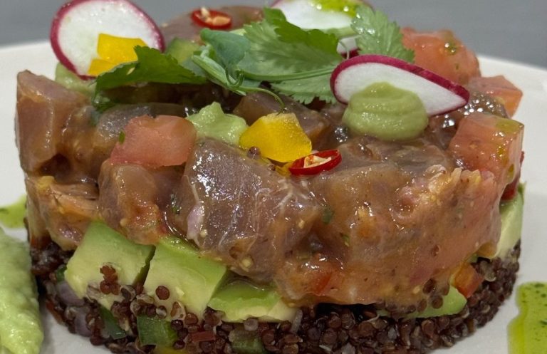 Atun fresco, quinoa roja, aguacate con aderezo oriental.
